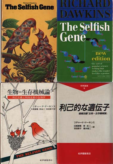 原書はその後、1989年に改訂版が出され、翻訳書も原題に忠実な『利己的な遺伝子』と改題されて1991年2月に出版された。翌、1992年にドーキンスが来日した際、原書のペーパーバックにサインをもらったのが今でも私の一番の自慢である。